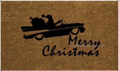 For eons, Santa’s been driving a sled around the world. You would think the odometer has rolled over several times already! Finally, he drops in and trades up for a V8 that at least relates to a third of the modern world. Show your christmas spirit with a custom doormat displaying Santa riding in a car that won’t pass any emissions inspection around the world.