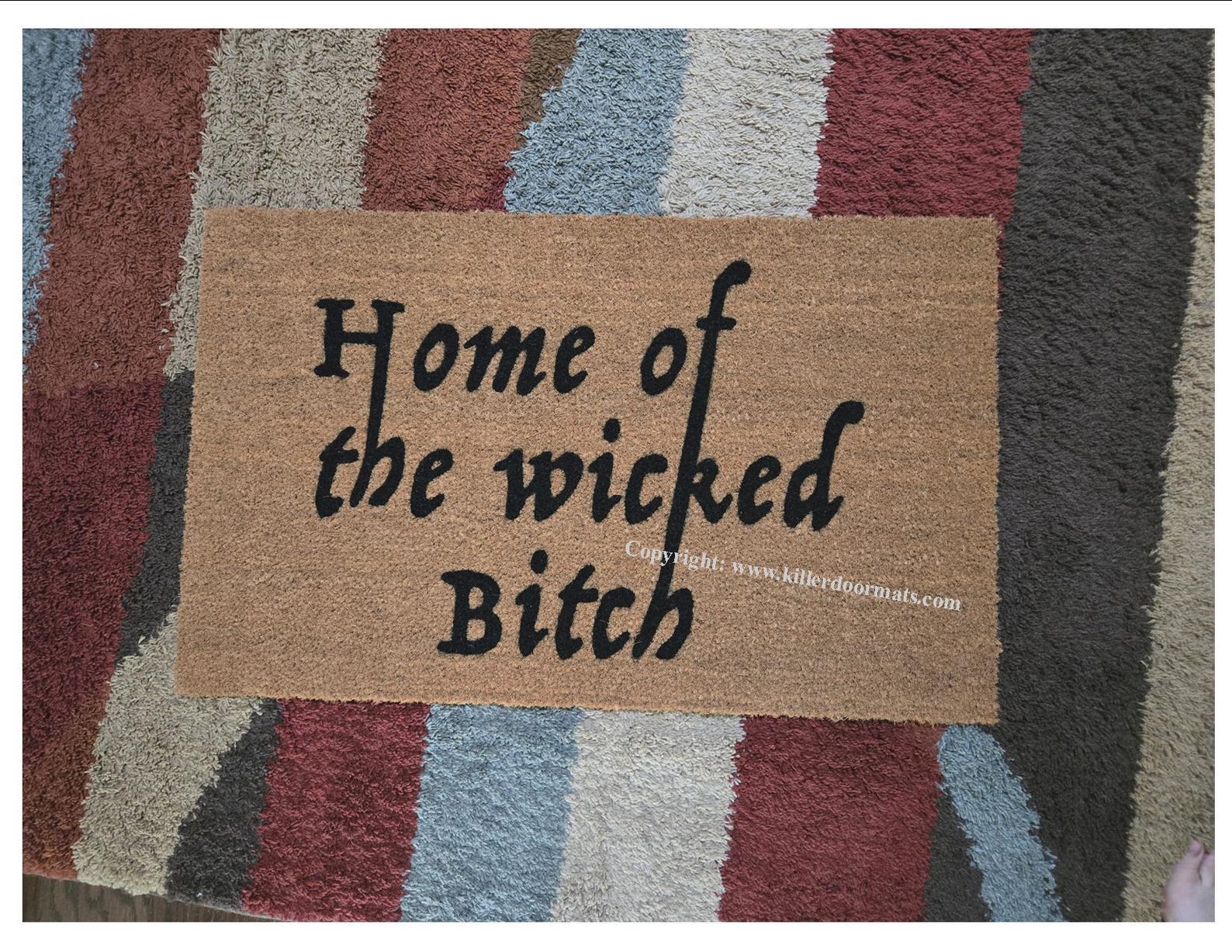 This hand crafted doormat is made of natural coco coir fibers. It is hand painted warns everyone the bitch is oh so wicked. Your custom doormat is made to order for you.